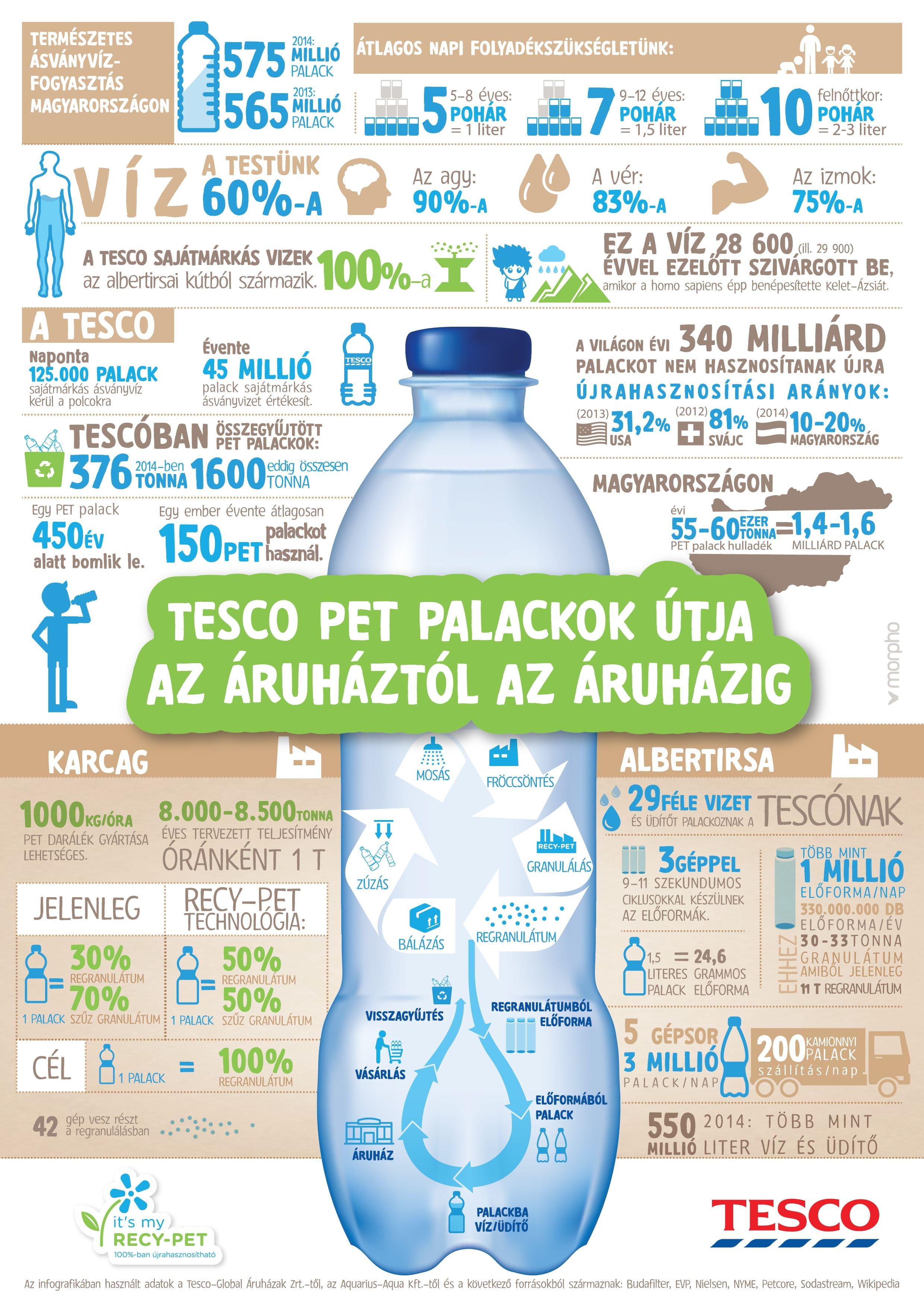 A Tesco vizeket és üdítőket ugyanitt, az albertirsai Aquarius-Aqua gyártósorain palackozzák, PET-palackokba. Jelenleg a világon 340 milliárd palackot nem hasznosítanak újra évente , Magyarországon pedig az évi 55-60 ezer tonna PET-palack hulladék alig 20 százalékát.